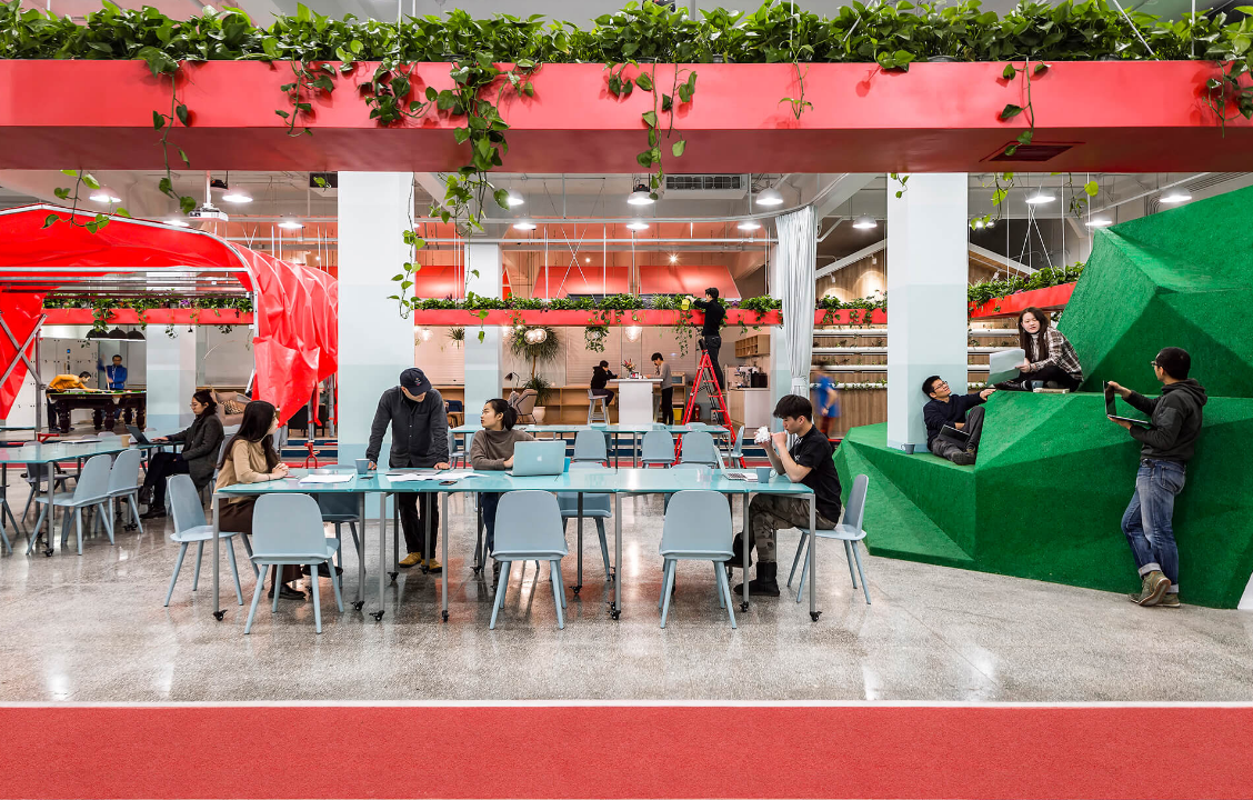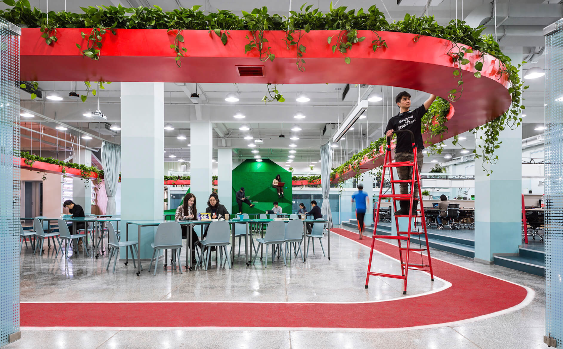 辦公室裝修設計上,用一個中間懸掛的“紅環”聯系在一起,紅環上種植蔬菜與植物,下面對應的是跑道。員工在跑道健步的同時可以打電話,也可以與照料植物的同事進行交談。