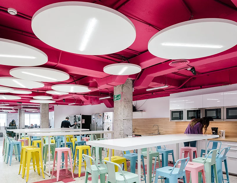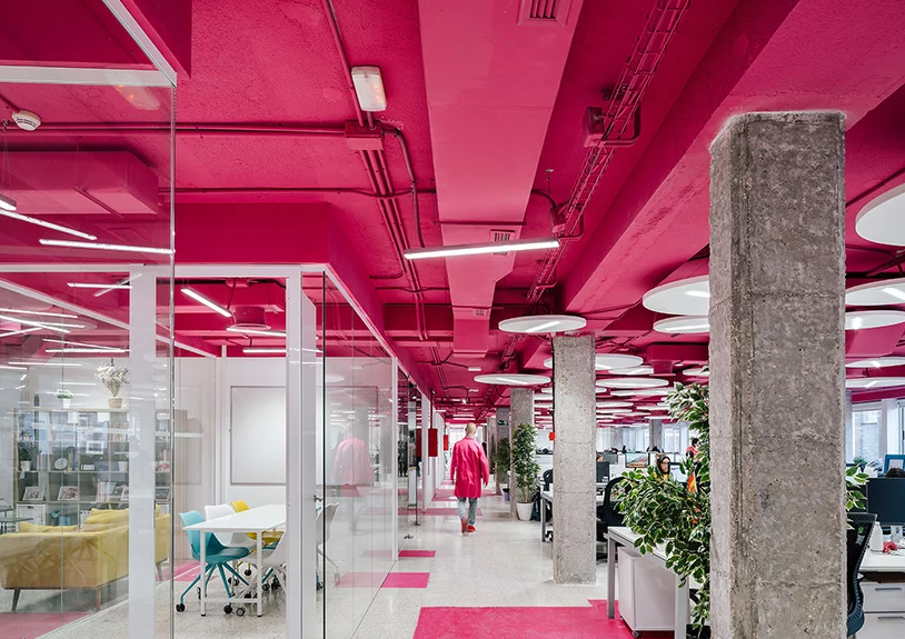 設(shè)計(jì)團(tuán)隊(duì)選擇通過應(yīng)用“歡樂的色彩”來活躍辦公室裝修效果。靈感來自建筑物的地下室,最近被涂成了明亮的檸檬黃,設(shè)計(jì)師決定將這種顏色的使用擴(kuò)展到所有樓層。