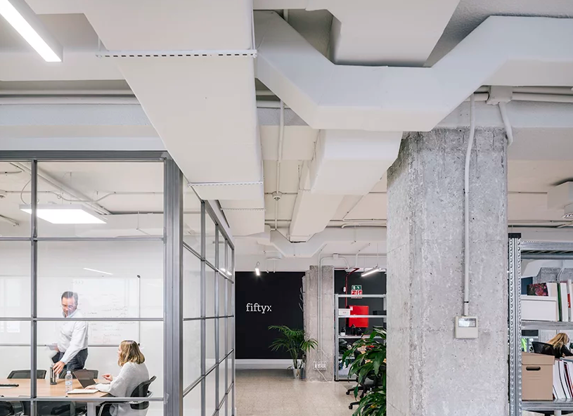 MARIANO是這家辦公室裝修設(shè)計(jì)的負(fù)責(zé)機(jī)構(gòu),他們將現(xiàn)有的工業(yè)建筑的特點(diǎn)(具有規(guī)則柱子和梁的混凝土結(jié)構(gòu))結(jié)構(gòu)元素,并且撤掉了原有的吊頂,保留原有的水磨石地磚,花崗巖的大堂和大面積的石灰石外墻。