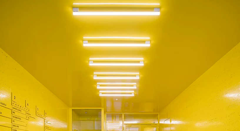 從地下停車場(chǎng)開始,黃色涂刷在所有的公共區(qū)和流通區(qū)域,只有現(xiàn)有的水磨石地板從大膽的色調(diào)中脫穎而出。不同的樓層有著不同的色調(diào),天花板上,燈具和周圍的白色墻壁突出。