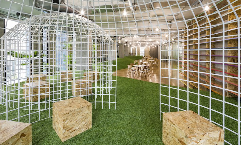 與暴露在外的混凝土地板形成鮮明對比的是,公司的標(biāo)志采用了多色條紋,展示了一個由一群五顏六色的人建造的地球儀。在其他地方的辦公室裝修設(shè)計中,類似鳥籠的結(jié)構(gòu)提供了非公開會議室的替代方案,并且可以移動以適應(yīng)各種情況。